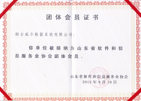 2012年9月,煙臺威爾數(shù)據(jù)系統(tǒng)有限公司正式被山東軟件和信息服務(wù)業(yè)協(xié)會接納為協(xié)會團(tuán)體會員,并被授予協(xié)會會員證書。