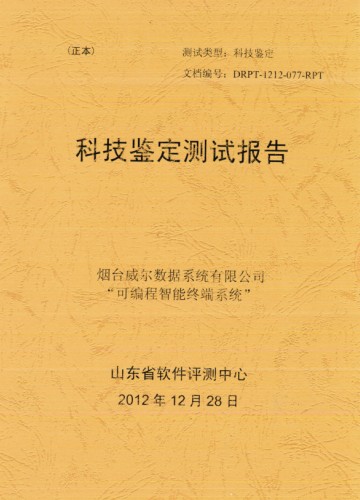 2012年12月27日,山東省軟件評測中心(SDSTC)對煙臺威爾數(shù)據(jù)系統(tǒng)有限公司“可編程智能終端系統(tǒng)”軟件項目進行了科技鑒定測試。測試結(jié)論表明,威爾“可編程智能終端系統(tǒng)”軟件項目達到預定目標,能夠在物聯(lián)網(wǎng)智能終端系統(tǒng)設計開發(fā)中使用。威爾“可編程智能終端系統(tǒng)”是一種為快速開發(fā)物聯(lián)網(wǎng)專業(yè)應用而研發(fā)的通用模塊化終端設備和開發(fā)工具,采用模塊化通用平臺替代專用芯片系統(tǒng),ARM處理器+LINUX操作系統(tǒng)的智能機概念以及可配置功能模塊將大大減少系統(tǒng)故障率并能提高系統(tǒng)性能。山東省軟件評測中心對“可編程智能終端系統(tǒng)”軟件項目的用戶文檔、功能性、可靠性、易用性四個方面進行了科技鑒定測試,測試結(jié)果完全符合國家標準GB/T 25000.51-2010中對用戶文檔要求及軟件質(zhì)量要求。