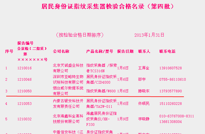 2013年2月19日,國家安全防范報(bào)警系統(tǒng)產(chǎn)品質(zhì)量監(jiān)督檢驗(yàn)中心、公安部安全與警用電子產(chǎn)品質(zhì)量檢測(cè)中心和公安部特種警用裝備質(zhì)量監(jiān)督檢驗(yàn)中心聯(lián)合公布了第四批居民身份證指紋采集器檢驗(yàn)合格企業(yè)名錄,煙臺(tái)威爾數(shù)據(jù)系統(tǒng)有限公司的指紋采集器憑借優(yōu)良的品質(zhì)和最新的科技率先通過了檢測(cè),為進(jìn)一步推進(jìn)和拓展二代指紋項(xiàng)目奠定了堅(jiān)實(shí)基礎(chǔ)。