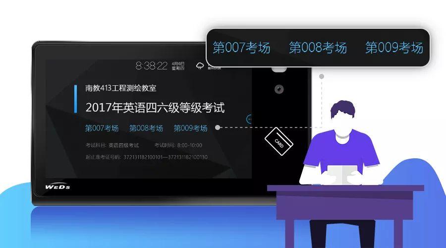 系統(tǒng)根據(jù)排考信息,在考試周的時候,智能終端自動轉(zhuǎn)換為展示考場信息,系統(tǒng)支持一教室多考場設(shè)置,除考場之外還可展示考務(wù)辦公室、試卷分發(fā)室等其余信息。