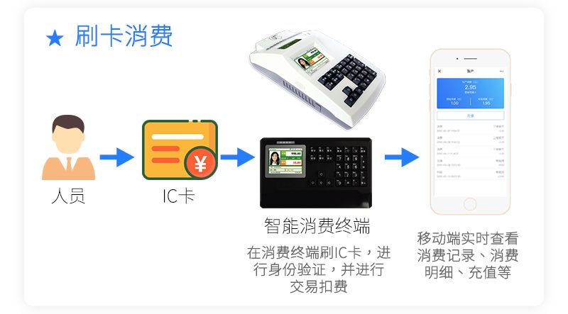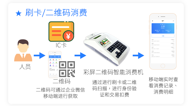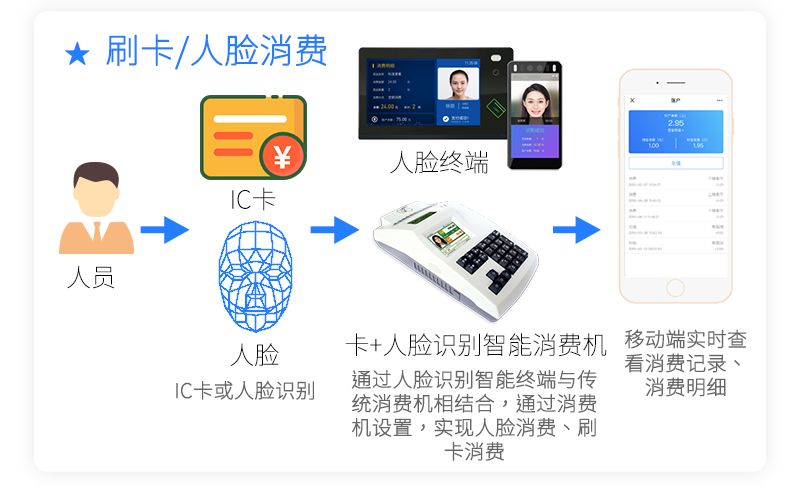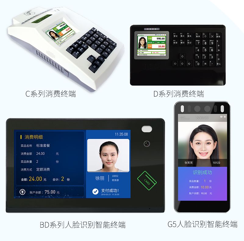持卡人開通電子錢包賬戶后,即可消費電子錢包余額。系統支持IC卡、NFC手機卡、2.4G手機卡、指紋、二維碼、人臉等多種識別方式
