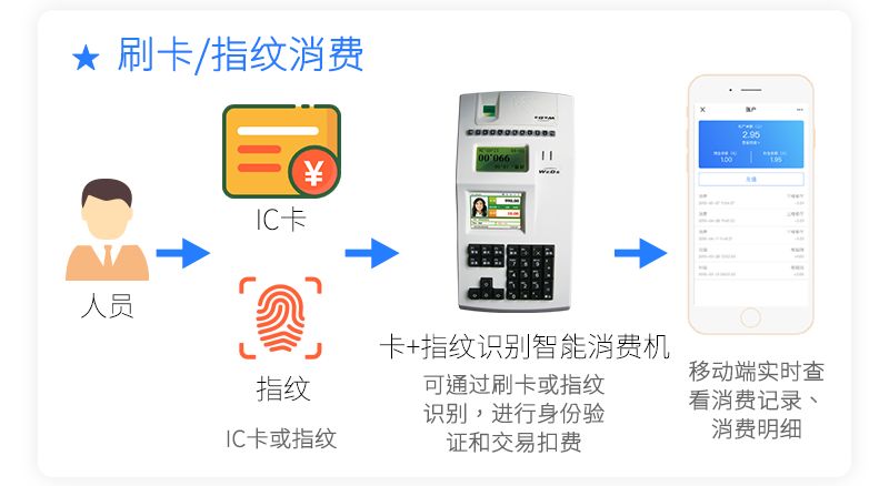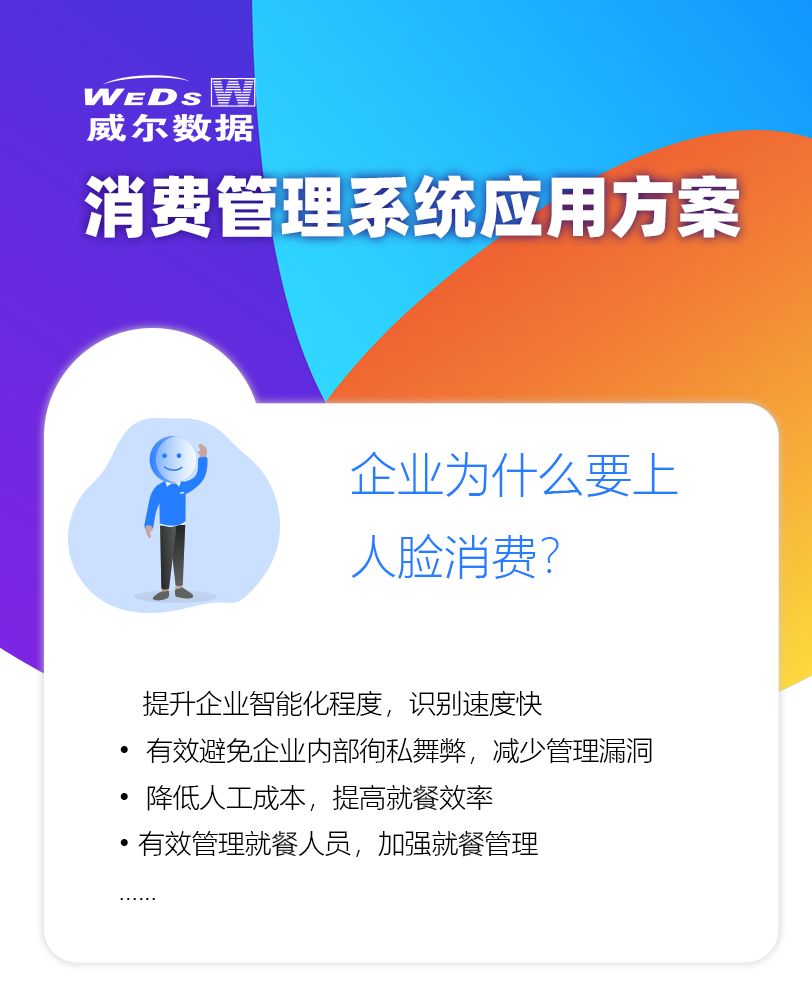 威爾消費管理系統主要是指員工在餐廳就餐、指定場所消費、充值等場景下,通過卡、二維碼、指紋、人臉識別進行身份驗證,對相應的關聯賬戶信息進行扣費、充值的系統。
