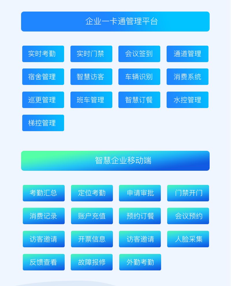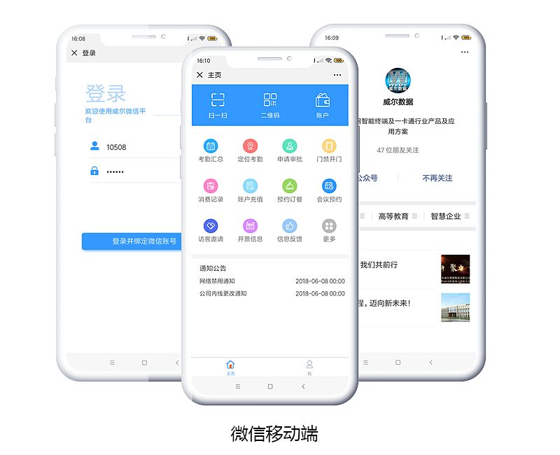 威爾智慧政企整體解決方案涵蓋政企日常管理的多維度應(yīng)用,通過(guò)微信移動(dòng)端可實(shí)現(xiàn)考勤管理、消費(fèi)充值、申請(qǐng)審批、遠(yuǎn)程開門、訪客管理等多項(xiàng)應(yīng)用,針對(duì)常態(tài)的會(huì)議管理、停車管理、班車管理等場(chǎng)景也配備相應(yīng)解決方案,水控管理、巡更管理、梯控管理等也囊括其中。