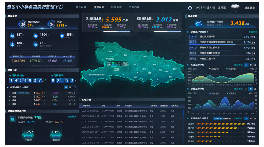 威爾協(xié)同教育云平臺 -智慧消費管理系統(tǒng),于2024年12月16日正式在湖北上線,截至目前(2025.4.23),威爾平臺一期部署消費設(shè)備8200臺,覆蓋湖北全省12個地市、59個區(qū)縣,建設(shè)2105所中小學(xué),惠及153萬師生,68萬家長,2025年春季開學(xué)至今,系統(tǒng)累計充值322萬筆,累計監(jiān)管充值金額8.1億元,交易7131萬筆。