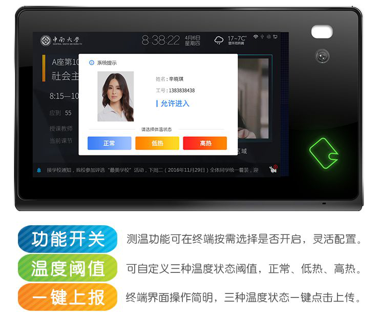 體溫上報(bào):終端構(gòu)建體溫狀態(tài)登記功能,在識(shí)別成功后,可根據(jù)溫槍結(jié)果對(duì)人員體溫狀態(tài)進(jìn)行登記,輕松達(dá)成人、溫合一,進(jìn)而滿足各方管控要求。