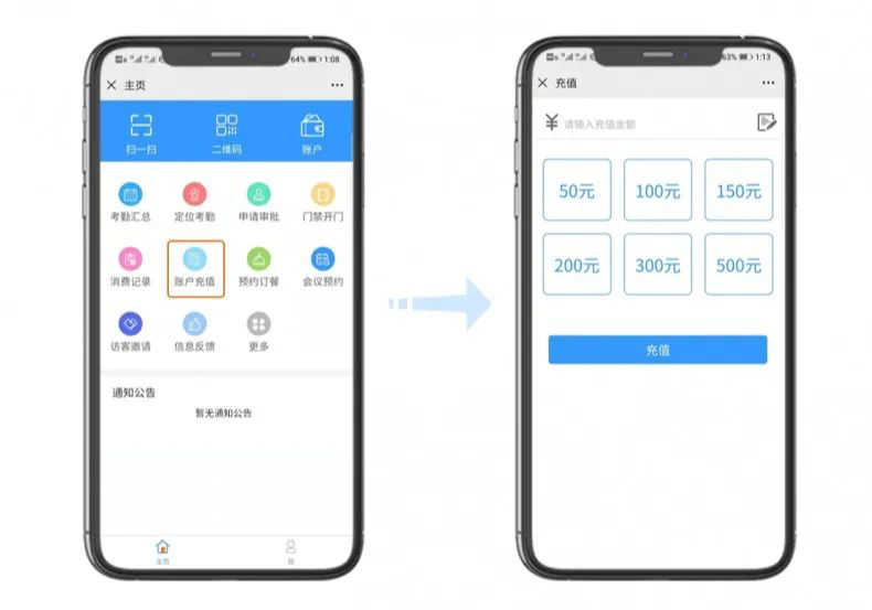 不再需要指定時(shí)間攜帶現(xiàn)金到餐廳人工充值,采用移動(dòng)端賬戶充值,系統(tǒng)可自動(dòng)判斷賬戶類型,若非本單位員工,則不享受就餐福利,且充值時(shí)自動(dòng)扣除部分“搭伙費(fèi)”。