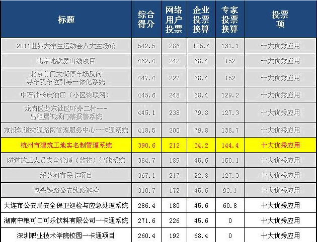 以下是“2011中國(guó)一卡通行業(yè)十大優(yōu)秀應(yīng)用”投票結(jié)果: